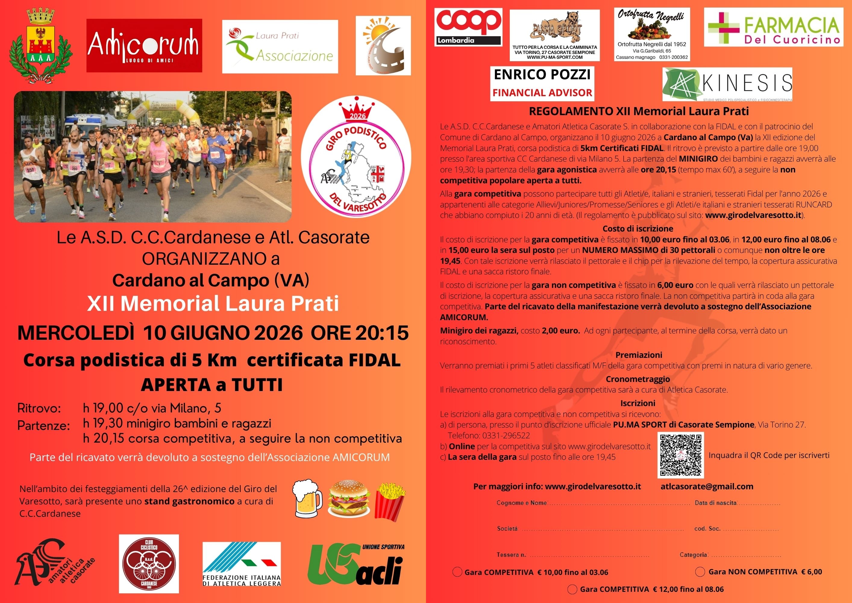 by A.S.D. Amatori Atletica Casorate SempioneIl 12° Memorial Laura Prati è la 5^ Tappa, in Cardano al Campo, del Giro podistico del Varesotto 2026. Manifestazione articolata in 5 prove serali a tempi, in provincia di Varese, inserite nel calendario FIDAL. Questa tappa, organizzata dalla società FIDAL A.S.D. Amatori Atl Casorate S. in collaborazione con il C.C.Cardanese A.S.D., è una 5Km certificata Fidal, così ogni partecipante iscritto alla gara competitiva avrà riconosciuto il tempo realizzato nelle graduatorie nazionali di specialità.