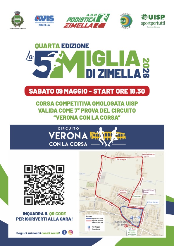 ASD Podistica Zimella, con l’approvazione di UISP Comitato Territoriale di Verona, con l’Assessorato alla Sport e il patrocinio del Comune di Zimella, ProLoco Zimella e AVIS Zimella, organizza per sabato 09/05/2026 la quarta edizione della manifestazione “LA 5 MIGLIA DI ZIMELLA”, competitiva valevole con la 7° prova del circuito di “VERONA CON LA CORSA”, per un totale di 8 km.
