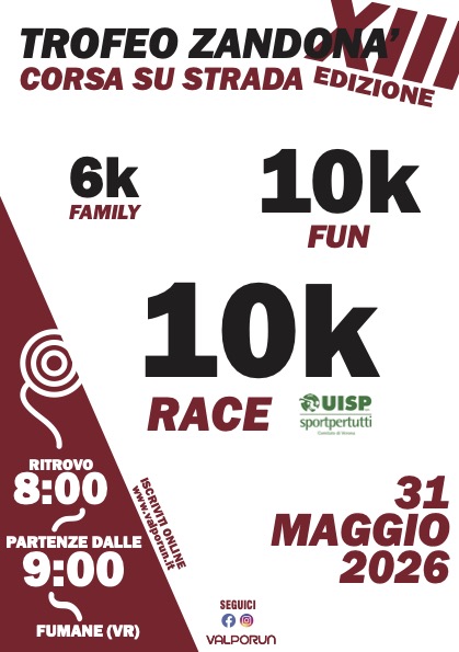 L’ASD Gruppo Podistico Gargagnago in collaborazione con l’ASD Banchette Runners (successivamente gli Organizzatori) organizzano il XIII Trofeo Zandonà, corsa podistica su strada, sia competitiva che non competitiva, declinata nelle seguenti versioni: